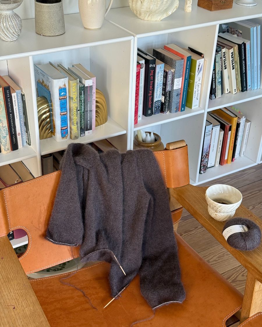 Den mørkelilla Ivy Blouse er strikket i Deluxe Silk Mohair fra Krea Deluxe i farven Aubergine [43].