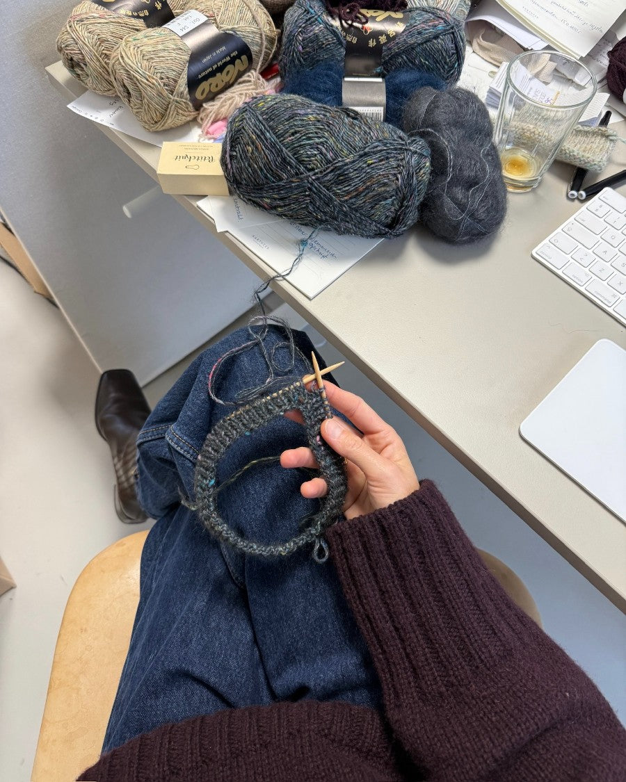 Die grüne Terrazzo Mütze ist in Silk Garden Sock von Noro in der Farbe Tweed moriguchi [T87] zusammen mit Silk Mohair von Isager in der Farbe 47 gestrickt.