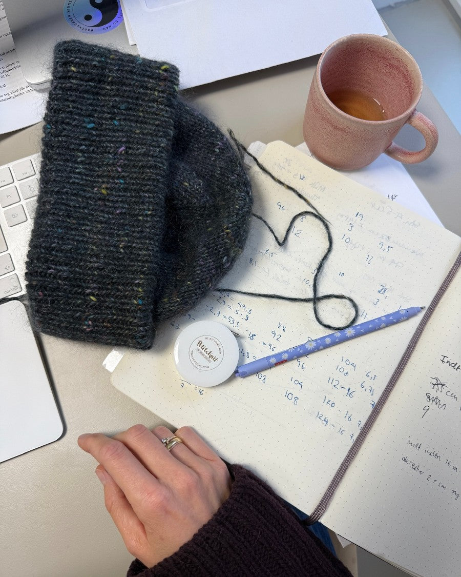 Terrazzo Mütze wird von unten nach oben gearbeitet, zuerst im Rippenmuster, danach glatt rechts. Der umgeklappte Rippenbündchen wird angestrickt. An der Mützenspitze erfolgen Abnahmen.