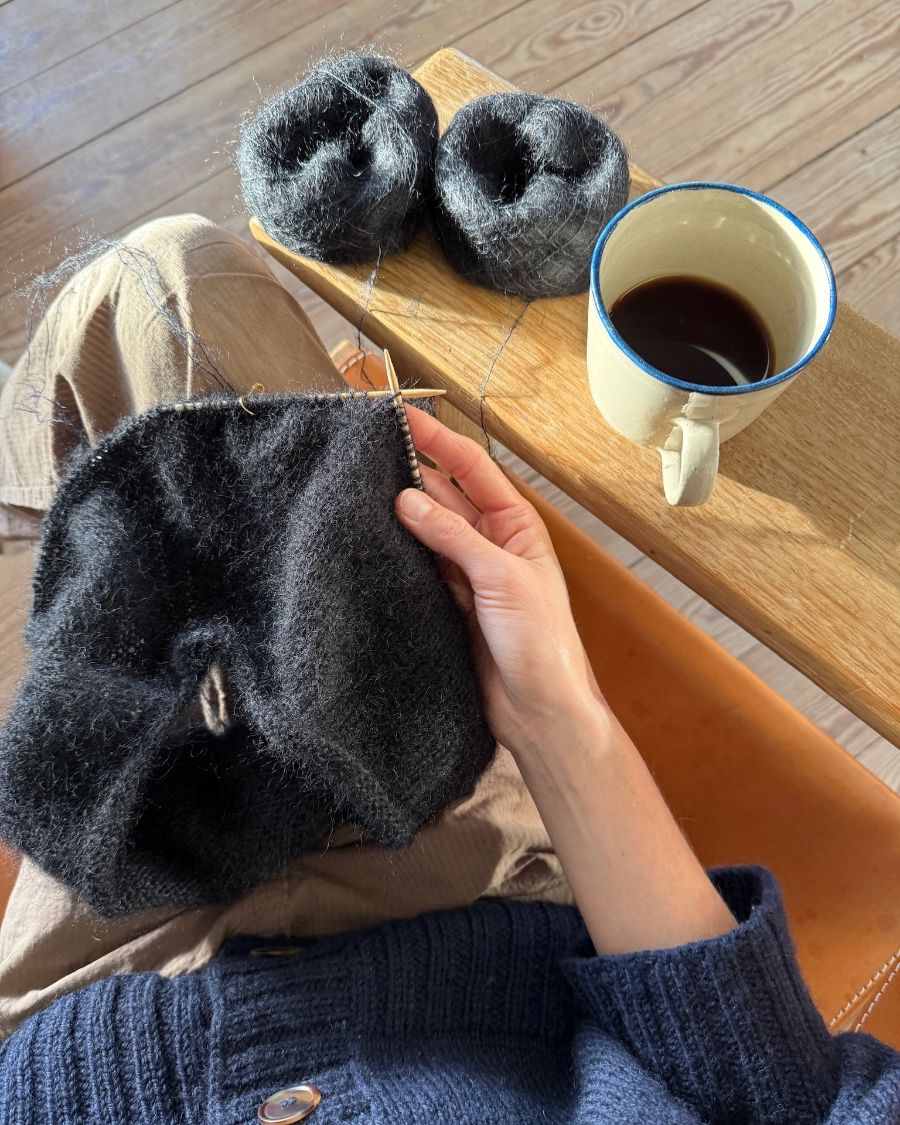 The black Bea Blouse is knitted in Brushed Lace by Mohair by Canard in the color Sort [3036].