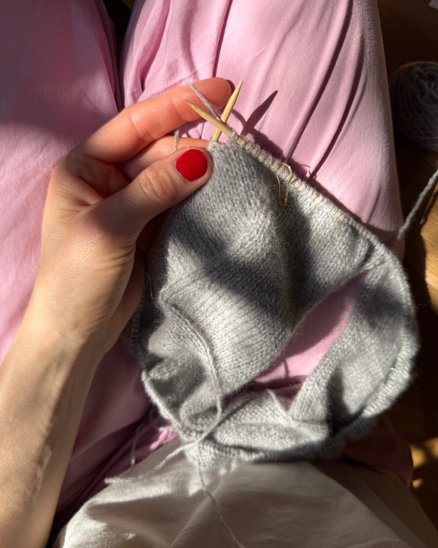 The grey Petra Polo is knitted in Cashmere by Sandnes Garn in the color Grey melange [1042].