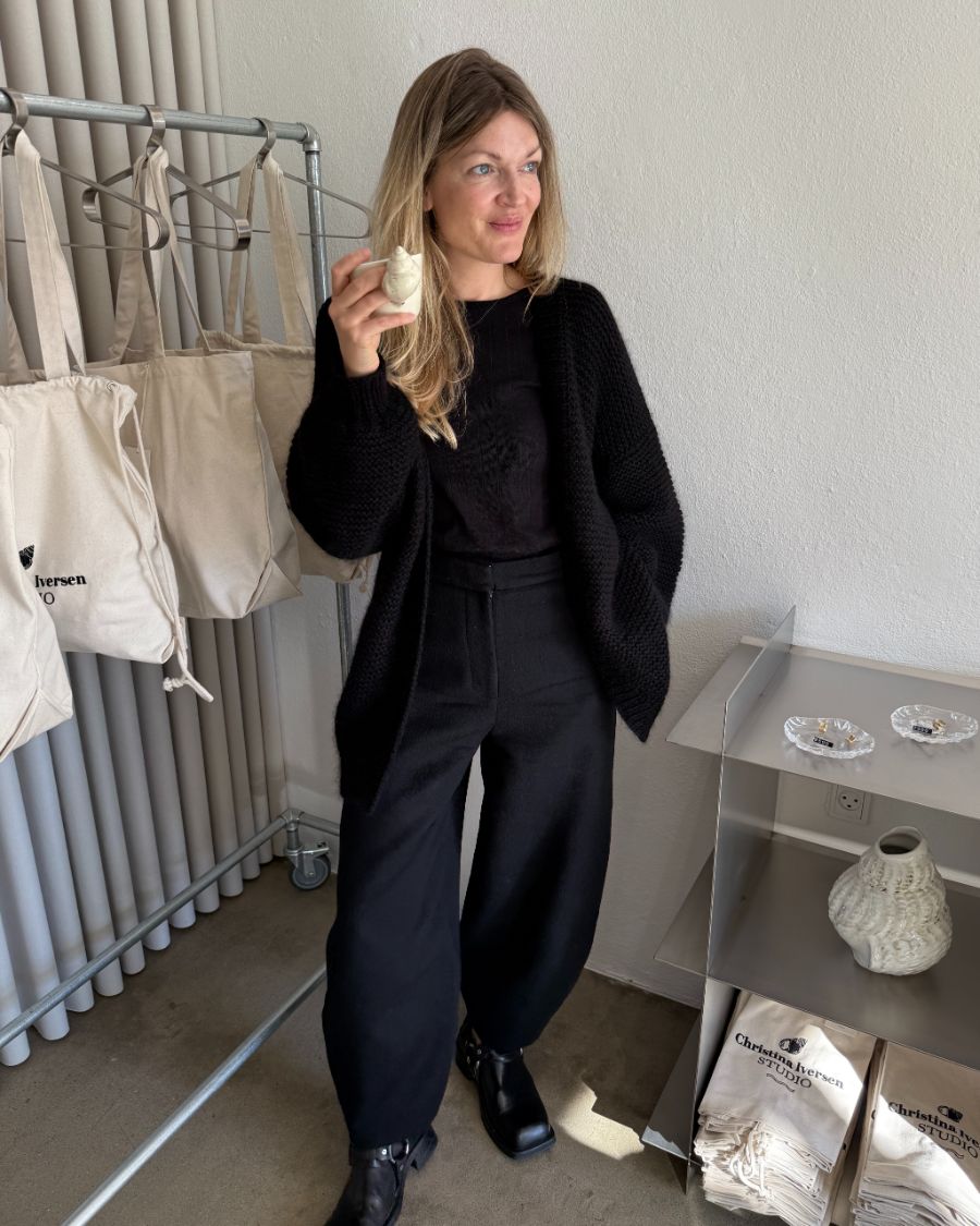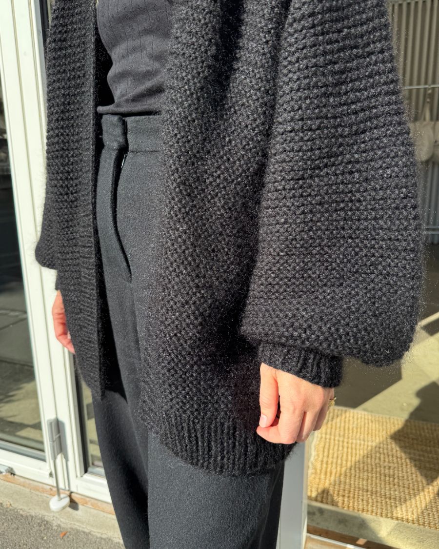 Den sorte Ballongjakken er strikket i Peruvian Highland Wool fra Filcolana i fargen Black [102] sammen med Tilia fra Filcolana i fargen Black [102].