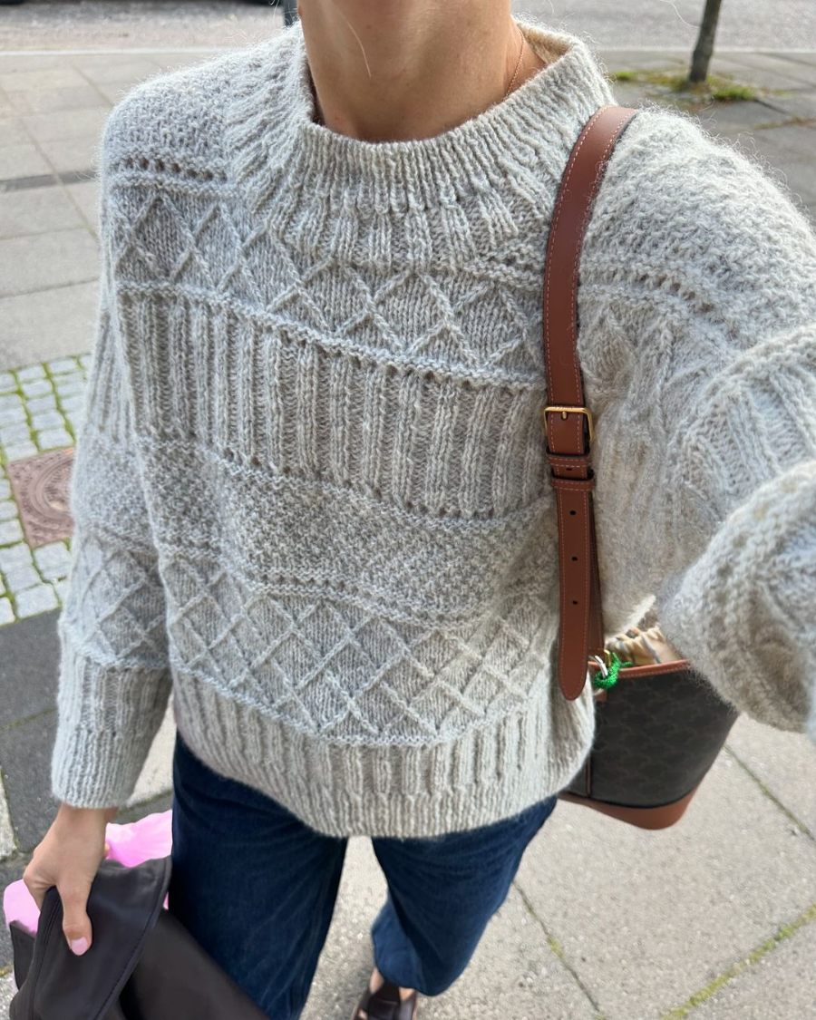 Den lysegrå Ingrid Sweater er strikket i Pelsuld 5,5/2 fra Hjelholts Uldspinderi i fargen Lys grå [03].
